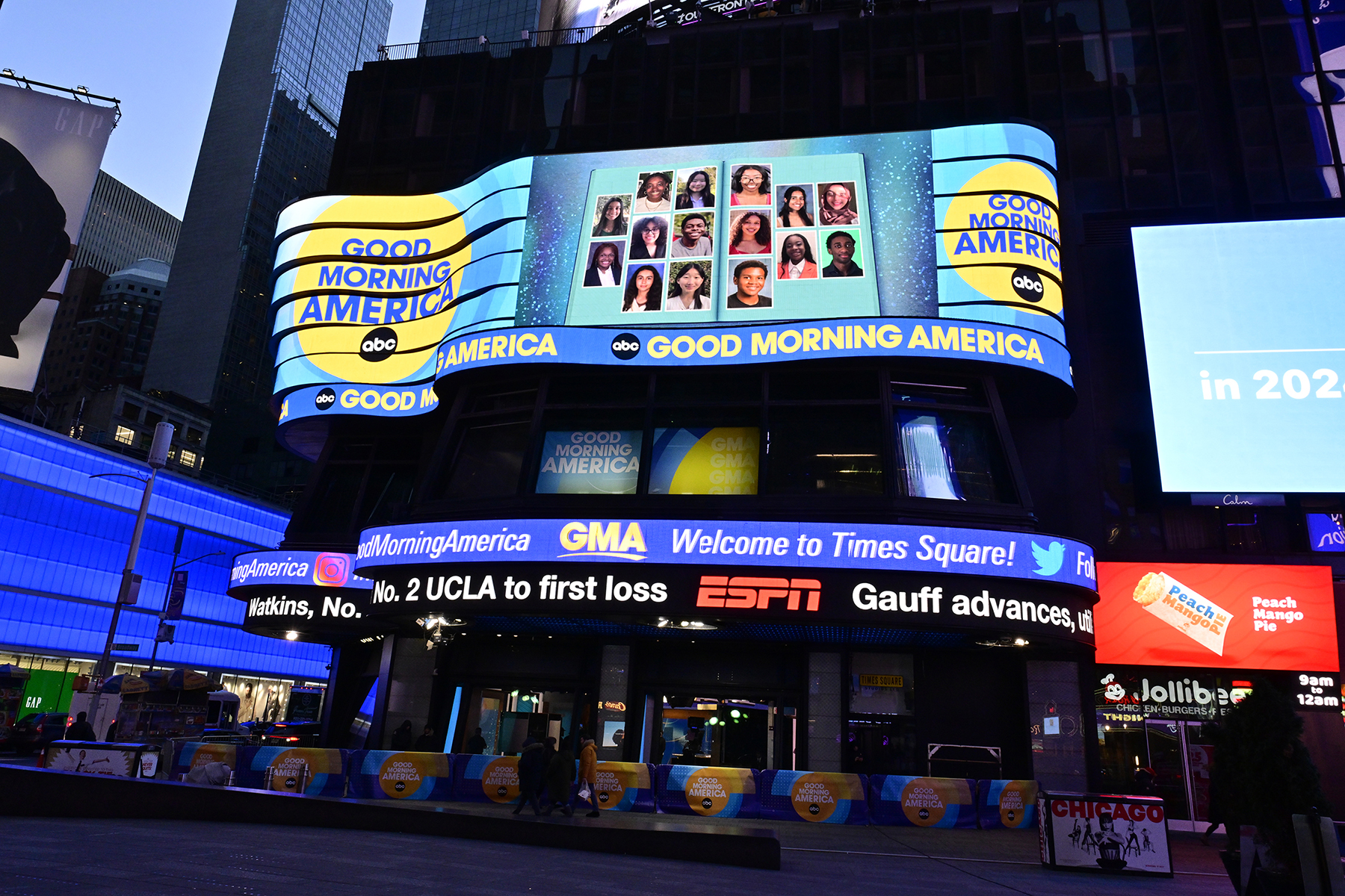 The names of the 100 high school students selected for this year’s Disney Dreamers Academy at Walt Disney World Resort appear on a billboard in Times Square in New York City on Jan. 15, 2024. The 2024 class was announced before one student was featured on national TV. Disney Dreamers Academy is a mentoring program hosted annually by Walt Disney World Resort in Lake Buena Vista., Fla., that fosters the dreams of Black students and teens from underrepresented communities. (ABC/Jeff Neira)