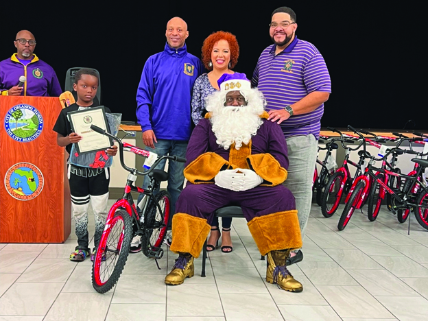 This year, Omega Claus descended upon Orlando on December 16th, at the L. Claudia Allen Senior Center located at 1840 Mable Butler Ave. marking the 21st year he has brought Christmas cheer to Central Florida. Omega Claus has its roots steep in the tradition of the Omega Psi Phi Fraternity, Inc., and its community outreach. Introduced by the Chi Tau Chapter of Greater Orlando, Omega Claus Initially sought to incentivize underserved students in the community to do well in school. Over the years it expanded in scope and rewards deserving elementary school children in Central Florida who are nominated by their teachers or school administrators for displaying an aptitude for scholarship and citizenship with a free bicycle during the holiday season. Delivering the program’s invocation, Theodore (“Jo-Jo”) Clark, a longstanding member of the fraternity and retired educator enlightened the audience saying, “Omega Psi Phi Fraternity was founded on November 17, 1911, and our Four Cardinal Principles are Manhood, Scholarship, Perseverance and Uplift. I want to thank the parents of these students for helping with their academic goals and instilling in them the aspects of good citizenship with the acceptance of these bicycles today.”
