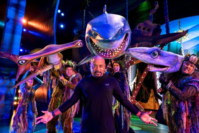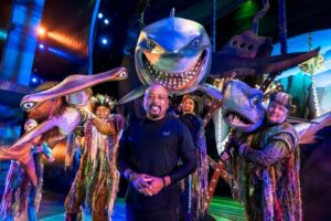Investor and star of ABC’s “Shark Tank” Daymond John goes for a “swim” with Bruce, Chum and Anchor from the hit Disney and Pixar film “Finding Nemo” at Walt Disney World Resort in Lake Buena Vista, Fla. John, who “Came To Play” at Disney with his family, ran into his new shark friends at “Finding Nemo: The Big Blue… and Beyond!” a spectacular stage show at Disney’s Animal Kingdom Theme Park. (Mariah Wild, photographer)