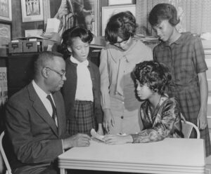 Valada Parker (Flewellyn) age 13, explains her petition to get Negro History in the Cleveland public schools to a member of the African American Historical and Culture Society, founded by Icabod Flewellen.