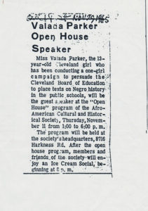 It was during her childhood campaign that she met her mentor, Icabod Flewellen, founder of the African American History Museum in 1953.   Until that time, most African American collections were kept in Black Colleges.   The Cleveland Call & Post, a Black newspaper, wrote about the young Valada Parker’s campaign.